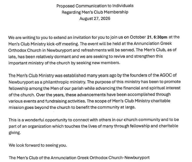 Men's Club Ministry Kick-off meeting - October 21, 2025 at 6:30pm, Read more...